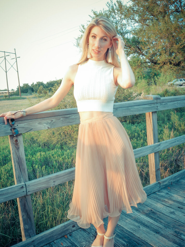 Com uma saia evasé, plissada ou até godê, também de cintura alta e em tons pastéis, o crop cria um um look romântico.